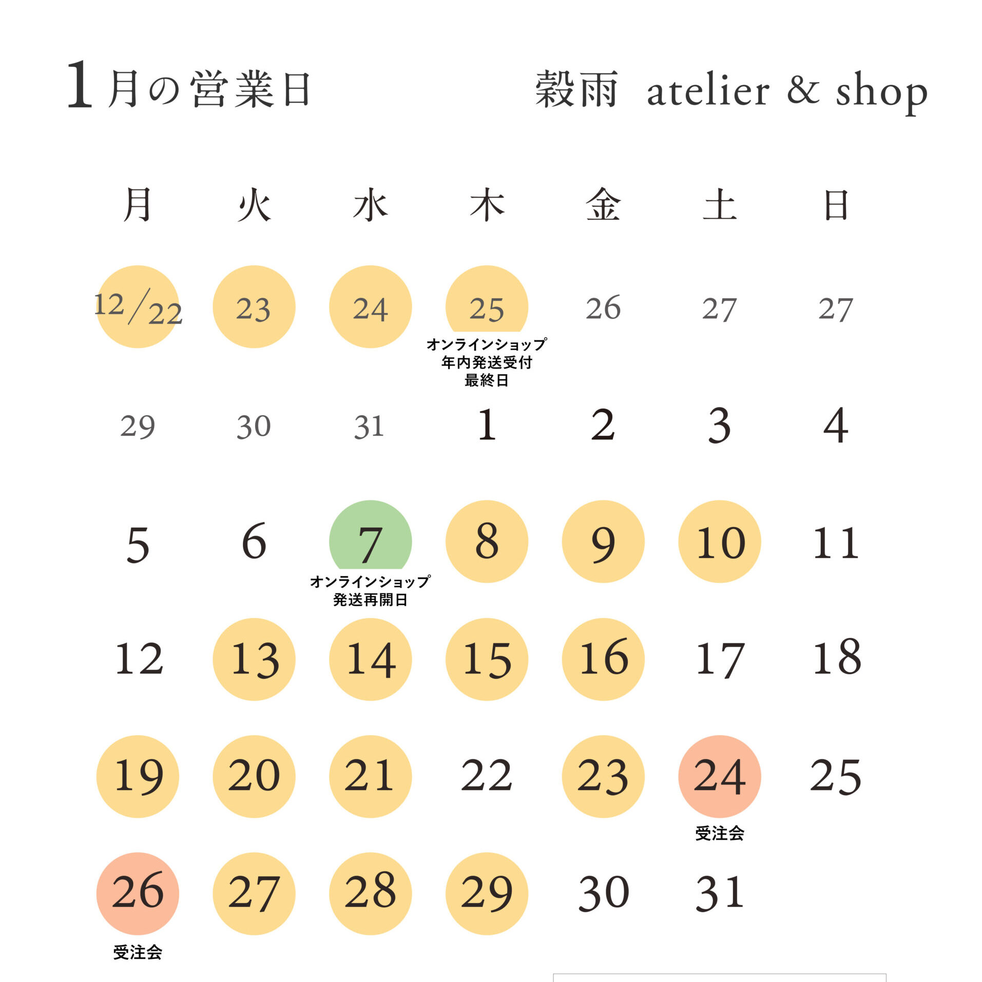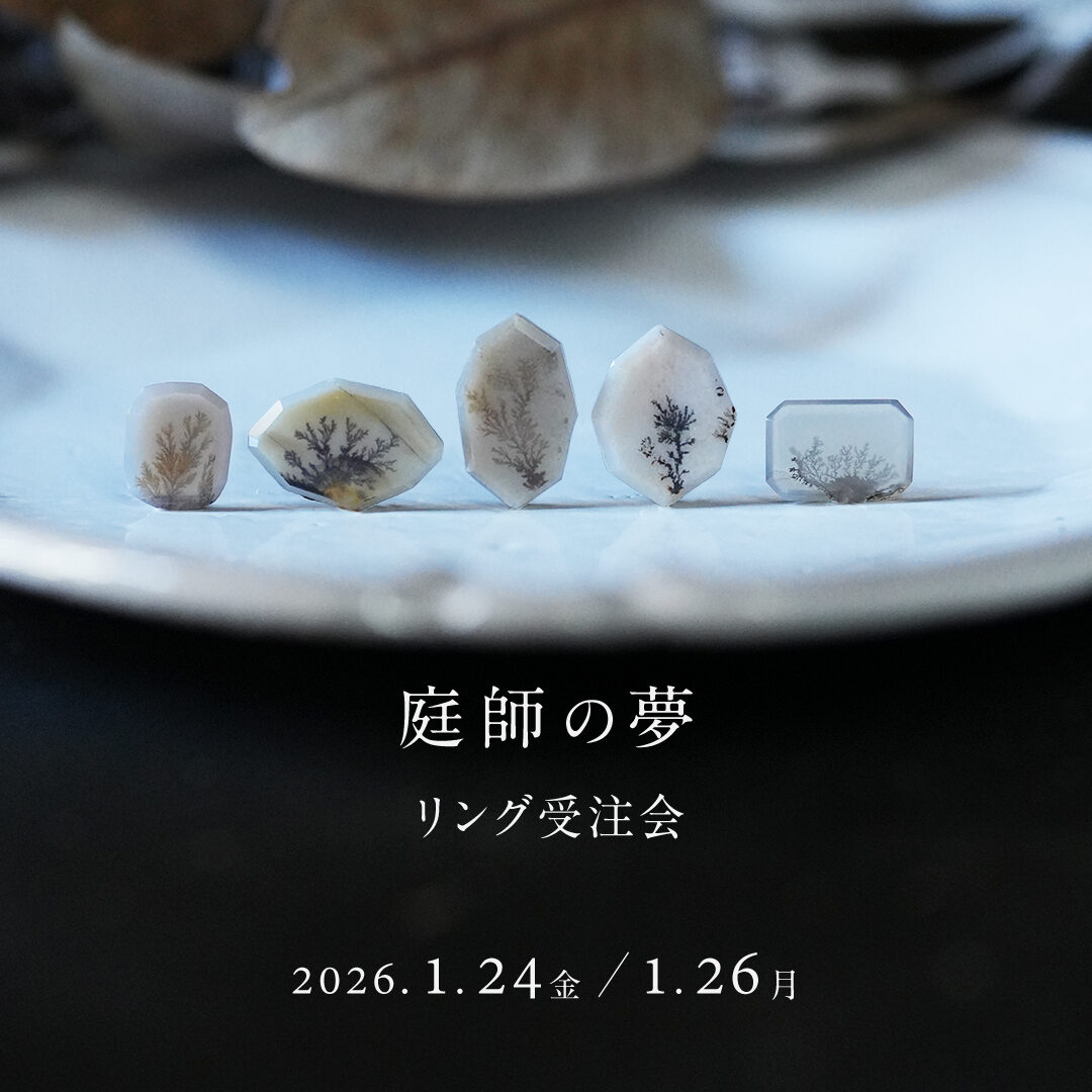 NEWS <1月 / 庭師の夢 リング受注会> 2026年1月8日 <1月の営業日> 2025年12月25日 アサヒグループ大山崎山荘美術館の開館30周年記念オブジェ制作いたしました 2025年12月18日 穀雨 POP UP【冬のひとさじ】 2025年12月1日 新作リング<庭師の夢>販売スタート 2025年11月25日 HAPPY HOLIDAYS ! 2025年11月20日