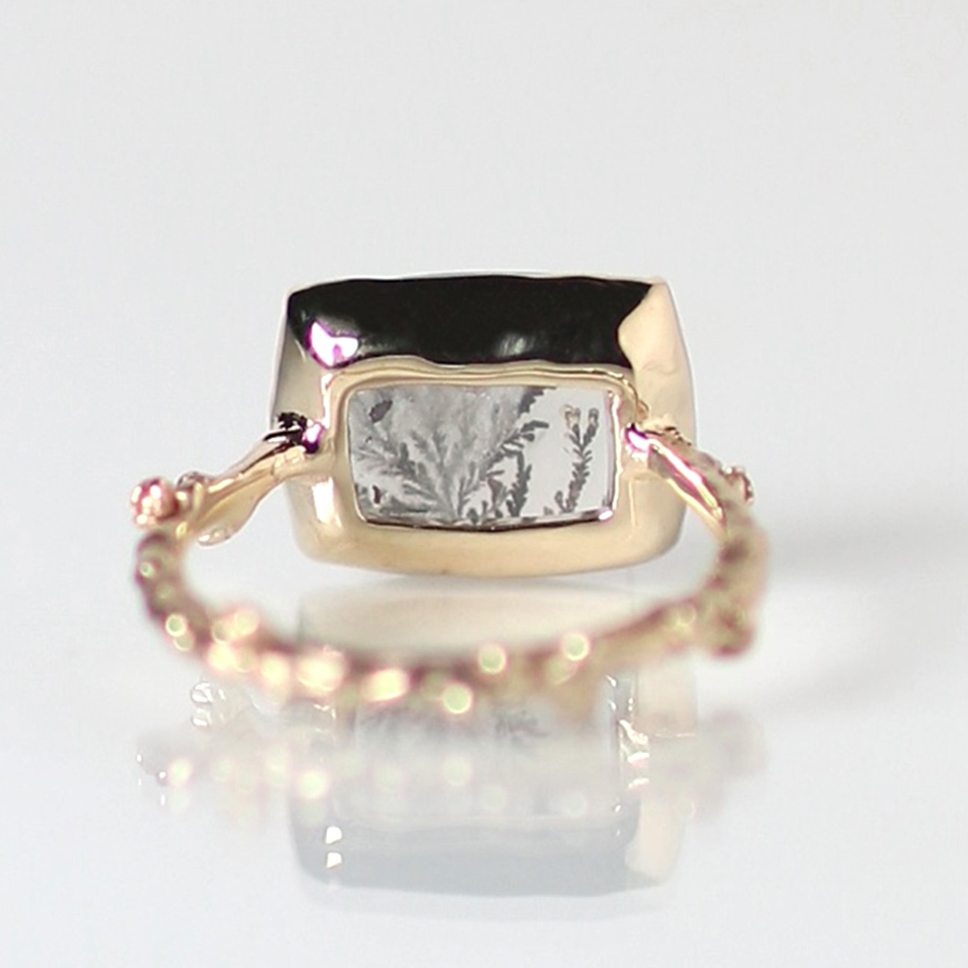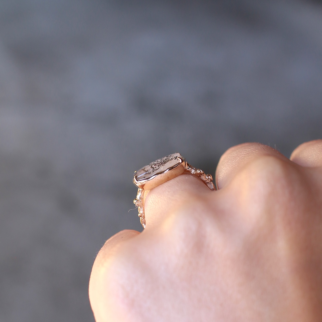 リングの腕部分は植物デザインで、