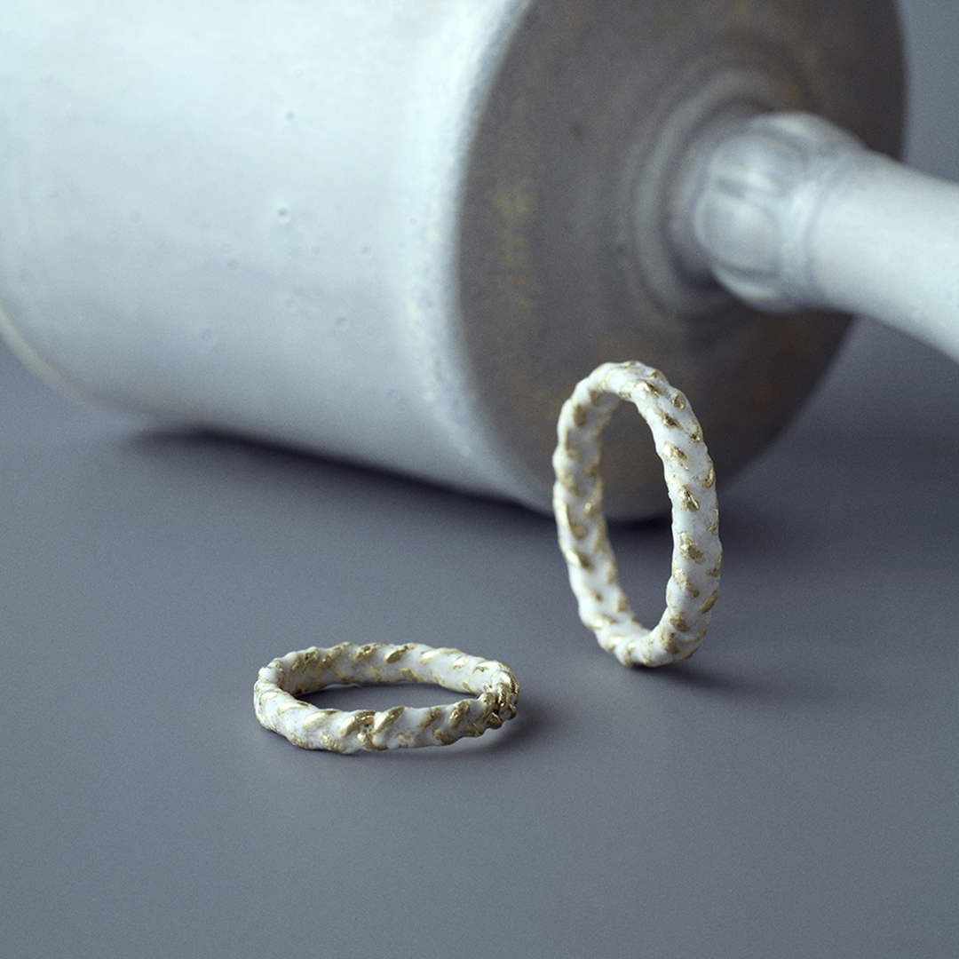 3本の線を編んだ形の上に、白いエナメル釉薬を焼き付けして仕上げています。